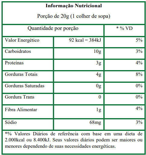 "Ingredientes: Amendoim, farinha de trigo, fécula de mandioca, creme de milho,